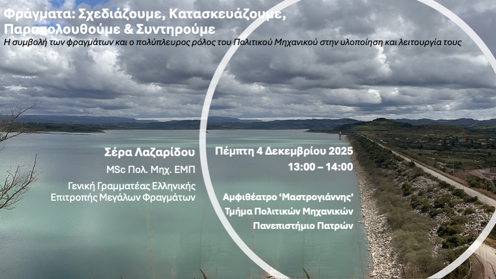 04.12.2025 Φράγματα: Σχεδιάζουμε, Κατασκευάζουμε, Παρακολουθούμε και Συντηρούμε – Η συμβολή των φραγμάτων και ο πολύπλευρος ρόλος του Πολιτικού Μηχανικού στην υλοποίηση και λειτουργία τους Σέρα Λαζαρίδου Flyer Ανακοίνωση Παρουσίαση